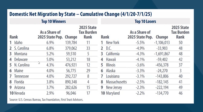The chart lists winner and loser states in terms of net population gain or loss.  On the loser side all the states except Alaska subject their residents to the highest tax burdens in the country.  The list makes it clear that higher taxes will force people to move.  The data also shows that low taxes don’t play as crucial a role as where they move to.