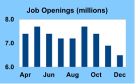 The latest JOLTS (job openings and labor turnover rates) report, covering the month of December, caught investors by surprise.  At the end of December, there were just 6.5 million job openings, far below the consensus forecast of 7.2 million and the lowest level since September 2020.  A smaller number of openings suggests that companies face less pressure to raise wages to hire enough workers, a sign of weakness for the labor market.