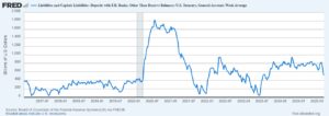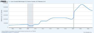 Since the peak in 2022, the Fed has let expiring debt roll off their balance sheet. How does debt expire? The Fed purchases US notes in various maturities; 3-Month, 6-Month, 1-Year, 2-Year, 10-Year, and 30-Year. For example, if they purchased $75-Billion in 2-Year notes in April of 2023, those notes will mature next month. Upon maturity the Treasury will pay back the $75-Billion bought by the Fed and that amount comes off the ledger above. The same is true for MBS when someone refinances or sells their home with a Fannie Mae or Freddie Mac mortgage. When that mortgage note is paid off it is subtracted from the Fred’s balance sheet.