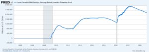The Federal Reserve buys US debt issued by the Treasury and also buys mortgages from Fanie Mae and Freddie Mac. The Fed holds TRILLIONS of dollars of both treasury notes and MBS. As you can see from the two graphs below, the Fed’s peak in holdings took place in 2022. In an effort to keep rates low during covid, the Fed purchased record amounts of US and MBS debt in 2020-2022. They artificially increased the demand to compensate for increased supply. That move by the Fed is what resulted in the lowest interest rates we’ve ever seen.