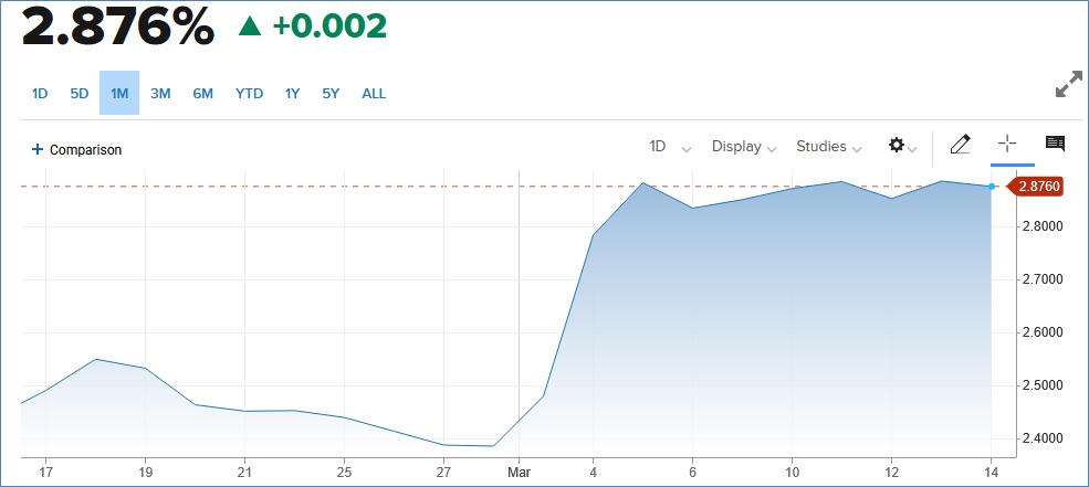 There’s also foreign competition for investors that buy bonds. Traditionally, the US has been the big spender in the world. We are not only the most charitable country, but we supplement the security of nations around the globe. The Trump administration wants to significantly reduce the amount we contribute worldwide to lower our deficit. That will require others to pick up the slack. The European Union announced on March 4th they have agreed in principal to fund $800-Billion Euros in new defense spending to make up for the US’s actions. That large amount of spending – not even approved yet, sent rates for the German equivalent to our US 10-Year Note (The German 10-Year Bund) to jump 22.5% overnight.