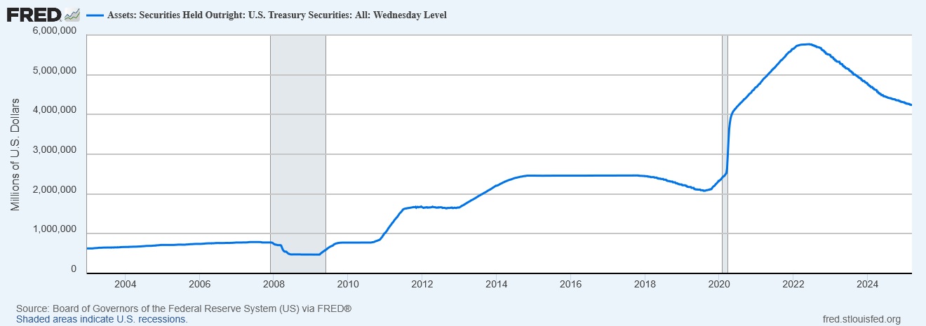 Since the peak in 2022, the Fed has let expiring debt roll off their balance sheet. How does debt expire? The Fed purchases US notes in various maturities; 3-Month, 6-Month, 1-Year, 2-Year, 10-Year, and 30-Year. For example, if they purchased $75-Billion in 2-Year notes in April of 2023, those notes will mature next month. Upon maturity the Treasury will pay back the $75-Billion bought by the Fed and that amount comes off the ledger above. The same is true for MBS when someone refinances or sells their home with a Fannie Mae or Freddie Mac mortgage. When that mortgage note is paid off it is subtracted from the Fred’s balance sheet.