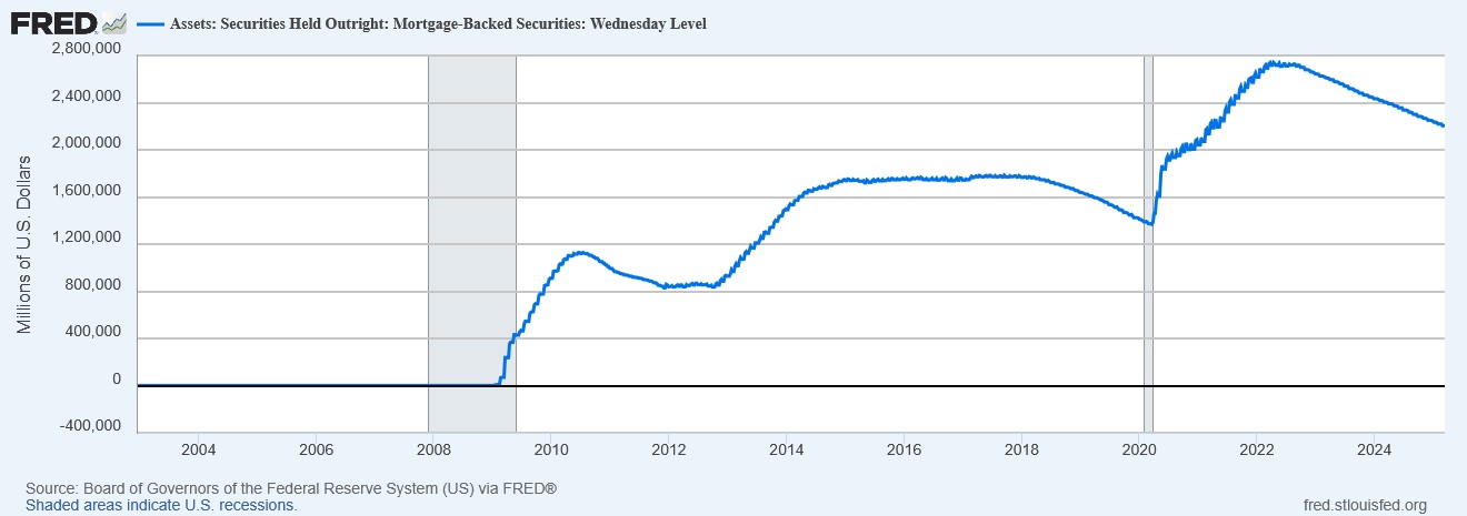 The Federal Reserve buys US debt issued by the Treasury and also buys mortgages from Fanie Mae and Freddie Mac. The Fed holds TRILLIONS of dollars of both treasury notes and MBS. As you can see from the two graphs below, the Fed’s peak in holdings took place in 2022. In an effort to keep rates low during covid, the Fed purchased record amounts of US and MBS debt in 2020-2022. They artificially increased the demand to compensate for increased supply. That move by the Fed is what resulted in the lowest interest rates we’ve ever seen.