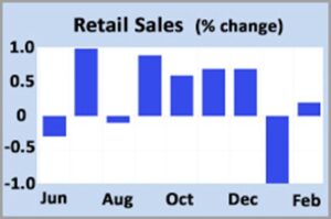 After unexpectedly slowing in January, consumer spending rebounded in February.  Retail sales rose 0.2% from January and were 3.1% higher than a year ago.  Strength was seen in personal care and online outlets, while bars and restaurants lagged.  Going forward, investors are wondering if consumers may scale back on purchases due to uncertainty about the economy and tariffs.